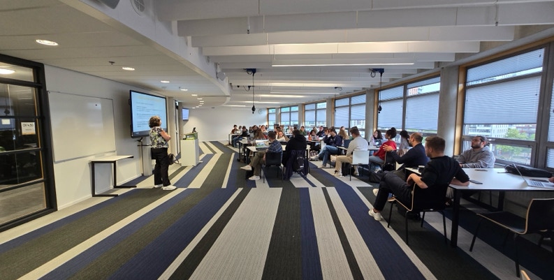 dr. Mendeltje van Keulen giving a lecture to students at The Hague University of Applied Sciences for the subject “Advanced Research Skills”, about how to conduct a research assignment, strengthening the students’ applied research skills and educating them on how to conduct applied research in a real-life situation. The research group European Impact was the assignment provider, further strengthening the impact of the applied research skills. (September 2024).