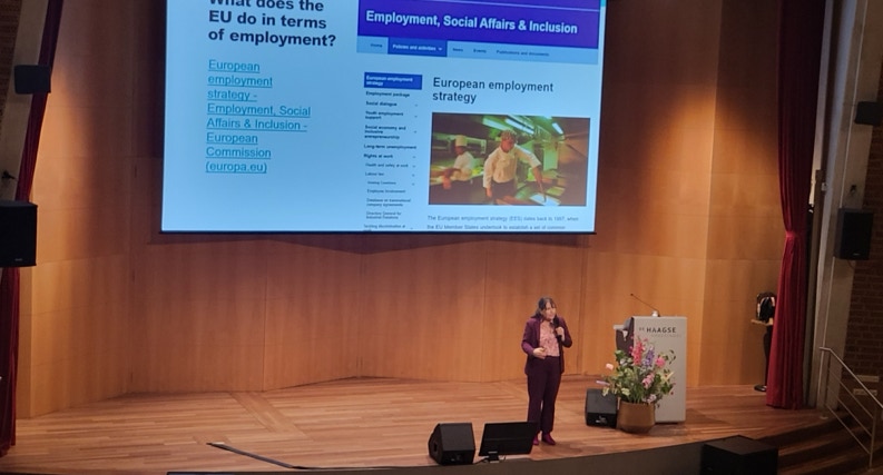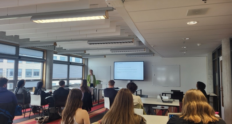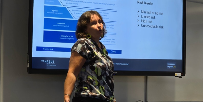 dr. Mendeltje van Keulen giving a lecture to students at The Hague University of Applied Sciences for the subject “Advanced Research Skills”, about how to conduct a research assignment, strengthening the students’ applied research skills and educating them on how to conduct applied research in a real-life situation. The research group European Impact was the assignment provider, further strengthening the impact of the applied research skills. (September 2024).