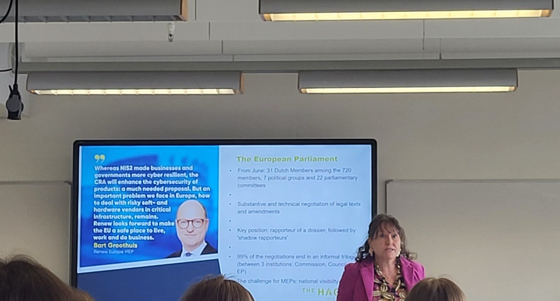 dr. Mendeltje van Keulen giving a lecture to students in The Hague University of Applied Sciences in the Hague about Managing Organisations in the EU (July 2024)