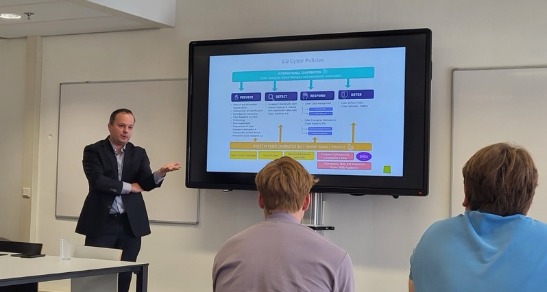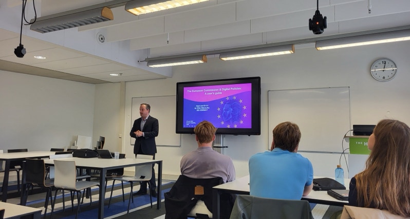 Witte Wijsmuller, Policy Assistant to the Director General at DG CONNECT in the European Commission, gave a guest lecture for the Challenges to European minors. During his guest lecture, Wijsmuller explained the role of DG Connect and its role in ensuring that Europe is “fit for the digital age”. He also touched upon EU investments in digital technologies, such as those via the Digital Europe Platform. Furthermore, he also discussed with the students specific pieces of EU digital policy, such as Cyber Skills Academy, the European Cyber Security Alarm System and the Cyber Solidarity Act. Wijsmuller also shared about different career paths and the impact that one can have on EU digital policy. (May 2024)